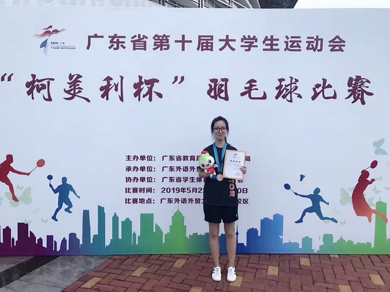 2019年5月22日至5月30日,广东省第十届大学生运动会羽毛球比赛在广东外语外贸大学(大学城校区)举行。我校2017级学生王科扬获得女子单打季军,2018级王霆瀚获得男子单打第七名。