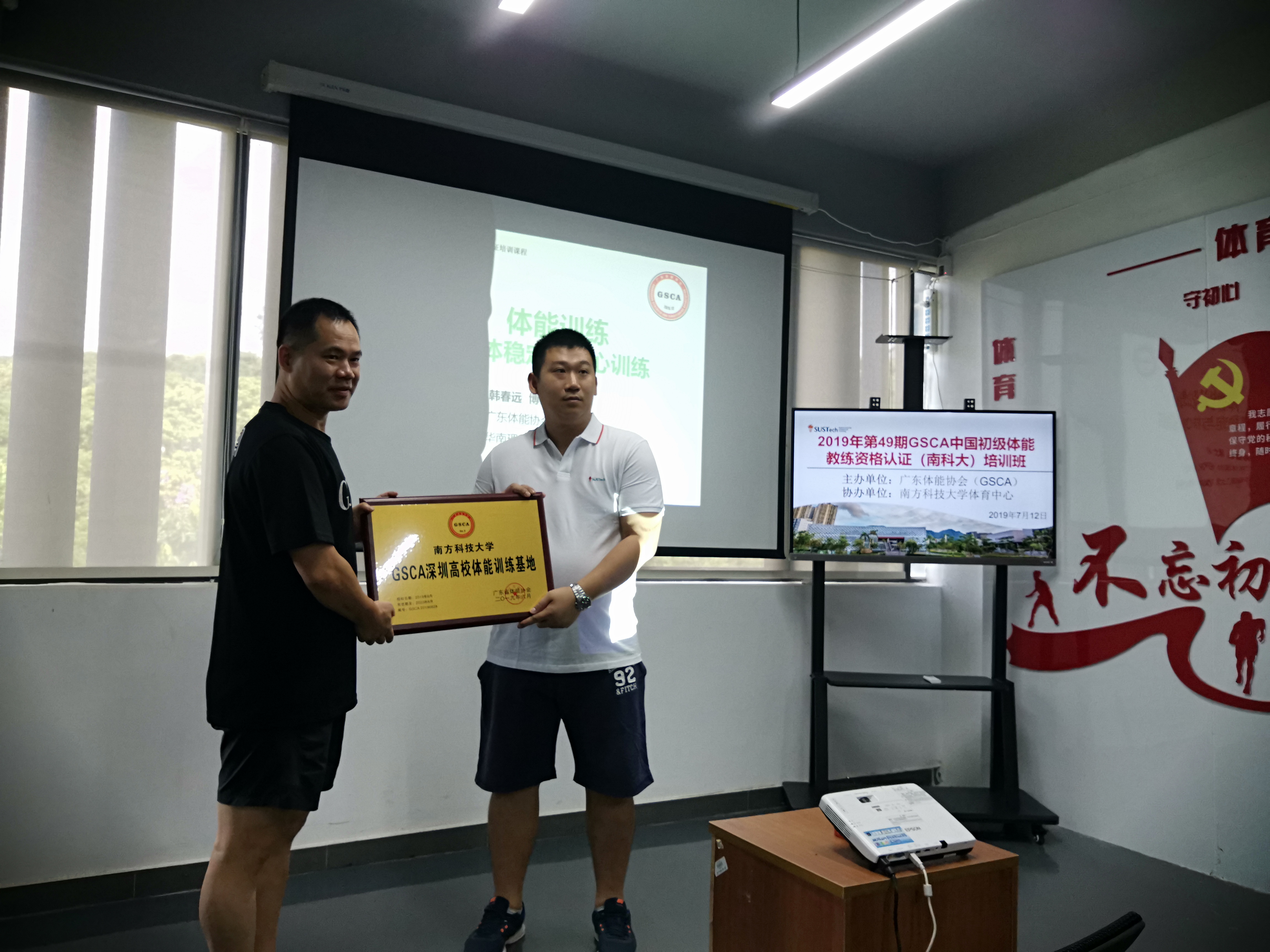 2019年7月12-13日,体育中心全体教师参加了第49期GSCA中国初级体能教练员资格认证培训班,本次培训班由广东体能协会(GSCA)主办、南科大体育中心协办。7月12日上午,广东省体能协会(GSCA)南方科技大学体能训练基地在南科大体育中心正式揭牌成立。广东体能协会秘书长韩春远博士、南科大体育中心主任董伦红教授以及参加初级体能教练员资格培训的30余名学员一同参加了揭牌仪式。