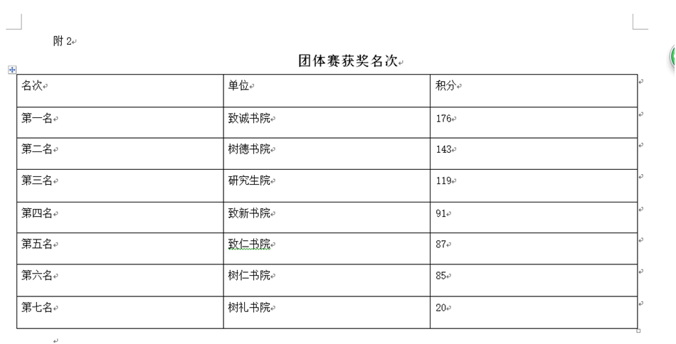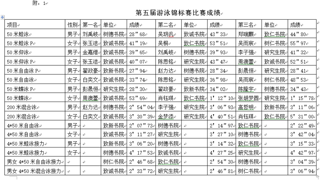 此次比赛最终致诚书院荣获冠军,树德书院荣获亚军,研究生院荣获季军。致诚书院张玉洁同学打破女子50米蛙泳、50米仰泳校记录,致新书院翟政豪同学打破男子50米自由泳校记录,研究生院彭晟恒打破男子50米蝶泳校记录,具体获奖情况如下: