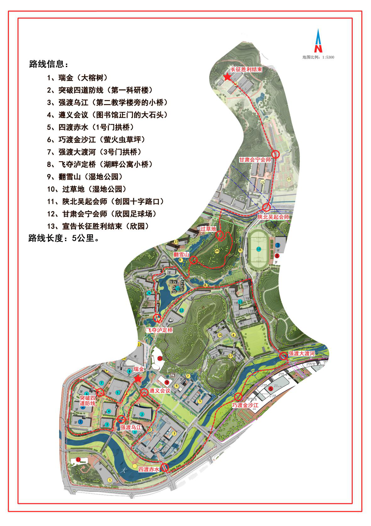 为缅怀先烈,重温历史,此次长跑活动根据学校路线景观等实际情况,绘制出了模拟长征线路图,并在沿途设置“瑞金(大榕树)、突破四道防线(第一科研楼)、强渡乌江(第二教学楼旁小桥)、遵义会议(图书馆正门大石头)、四渡赤水(1号门拱桥)、巧渡金沙江(萤火虫草坪)、强渡大渡河(3号门拱桥)、飞夺泸定桥(湖畔公寓小桥)、翻雪山(湿地公园)、过草地(湿地公园)、陕北吴起会师(创园十字路口)、甘肃会宁会师(欣园足球场)、长征胜利结束(欣园)”,共13个重要线路点。