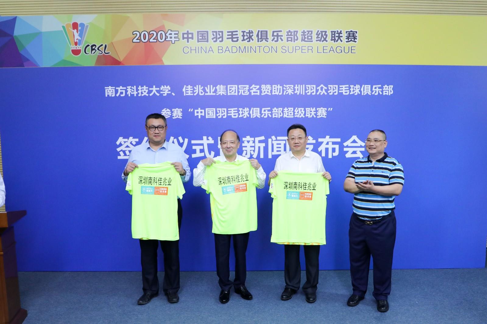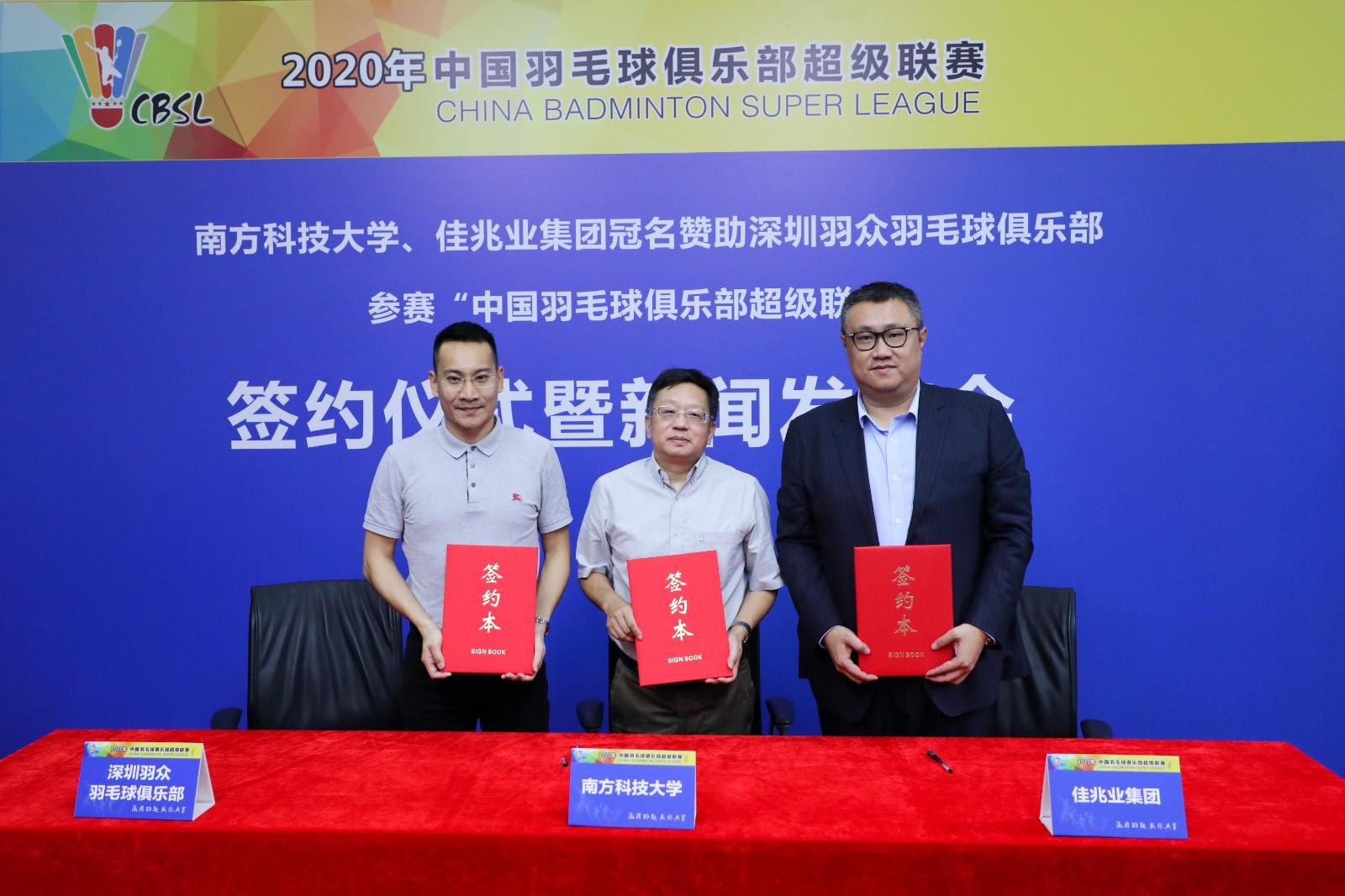 仪式上,南方科技大学、佳兆业集团和深圳羽众羽毛球俱乐部代表签署协议,正式宣布2020年新赛季将以“深圳南科佳兆业”(简称“深圳南科大”)队名征战中国羽毛球俱乐部超级联赛。根据协议,在2020赛季至2024赛季共五个赛季,南科大作为球队赞助期的冠名合作方,对球队参加羽超联赛期间提供合作冠名支持;佳兆业作为球队赞助期的赞助商,对球队参加羽超联赛期间冠名提供资金支持。