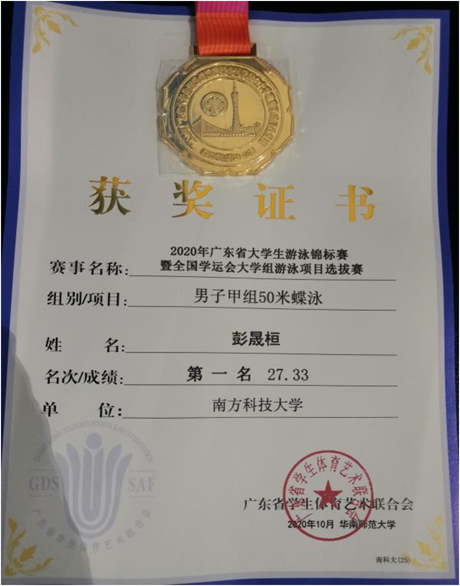 此次比赛彭晟桓同学还获得甲组男子50米自由泳第四名;2019级白弈文同学获得甲组女子200米混合泳第三名、100米自由泳第五名;2020级李蔚同学获得甲组男子100米自由泳第四名、200米自由泳第八名;魏伟成老师获得优秀教练员。在上周刚刚结束的南方科技大学第六届游泳锦标赛上彭晟桓同学刚刚打破我校男子50米蝶泳、50米自由泳2项校记录。