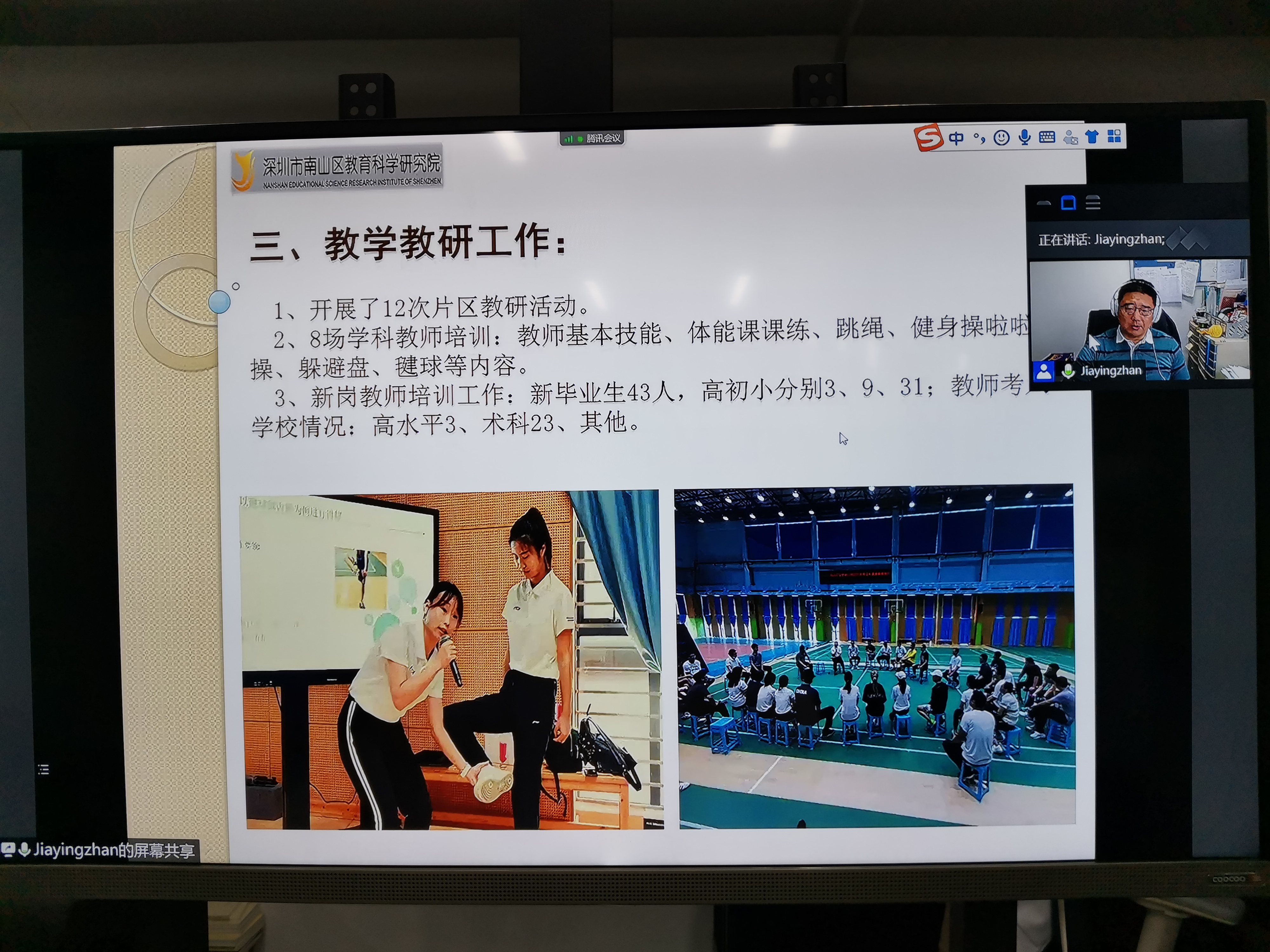 为了更好的推进我校体育课程改革,提高教学质量和师资教学水平,应体育中心邀请,深圳市南山区教育科学研究院德体卫艺部副部长、中学高级教师贾颖战于2月24日在线上(腾讯会议)为体育中心教师开展题为:《基础体育教育发展创新》专题讲座,体育中心全体教师在中心会议室聆听了此次讲座。