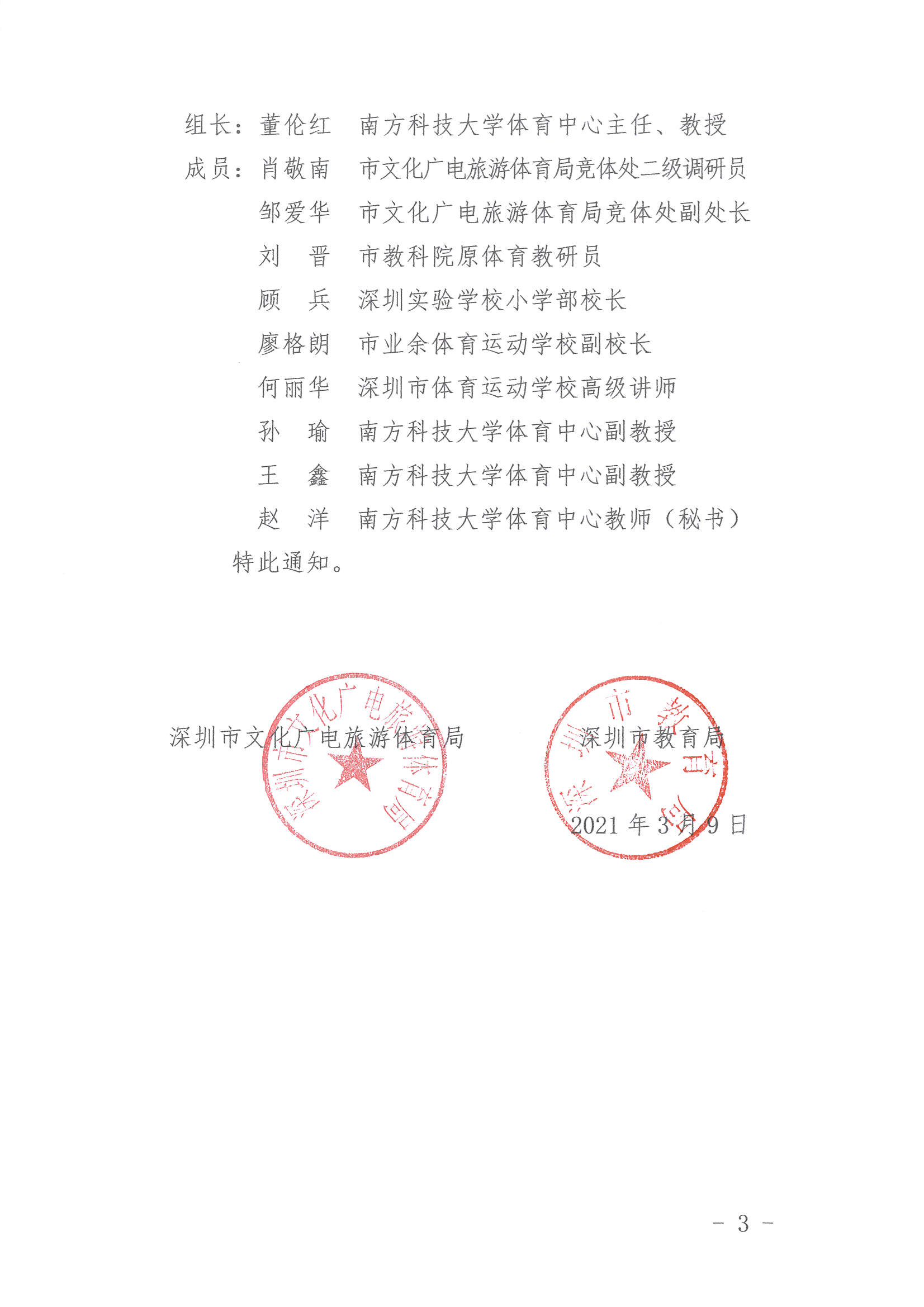 3月9日,深圳市文化广电旅游体育局联合深圳市教育局发文《关于成立深圳市推进体教融合工作调研专家组的通知》,我校体育中心主任董伦红教授被当选为深圳市推进体教融合工作调研专家组组长,主要负责深圳市出台实施方案的调研、咨询、论证和文本撰写等工作,同时当选为调研专家组组员的还有体育中心孙瑜、王鑫、赵洋三位老师。
