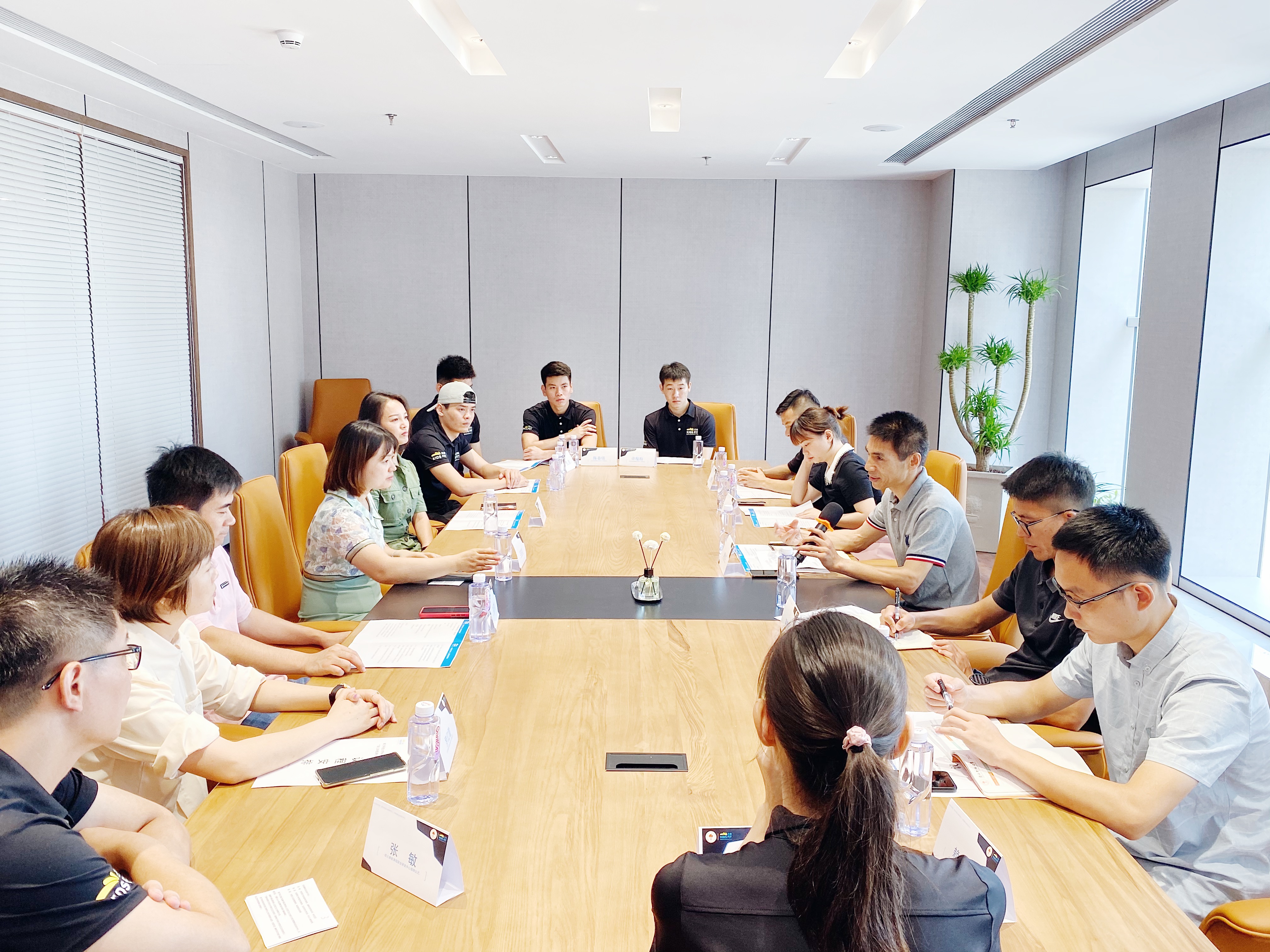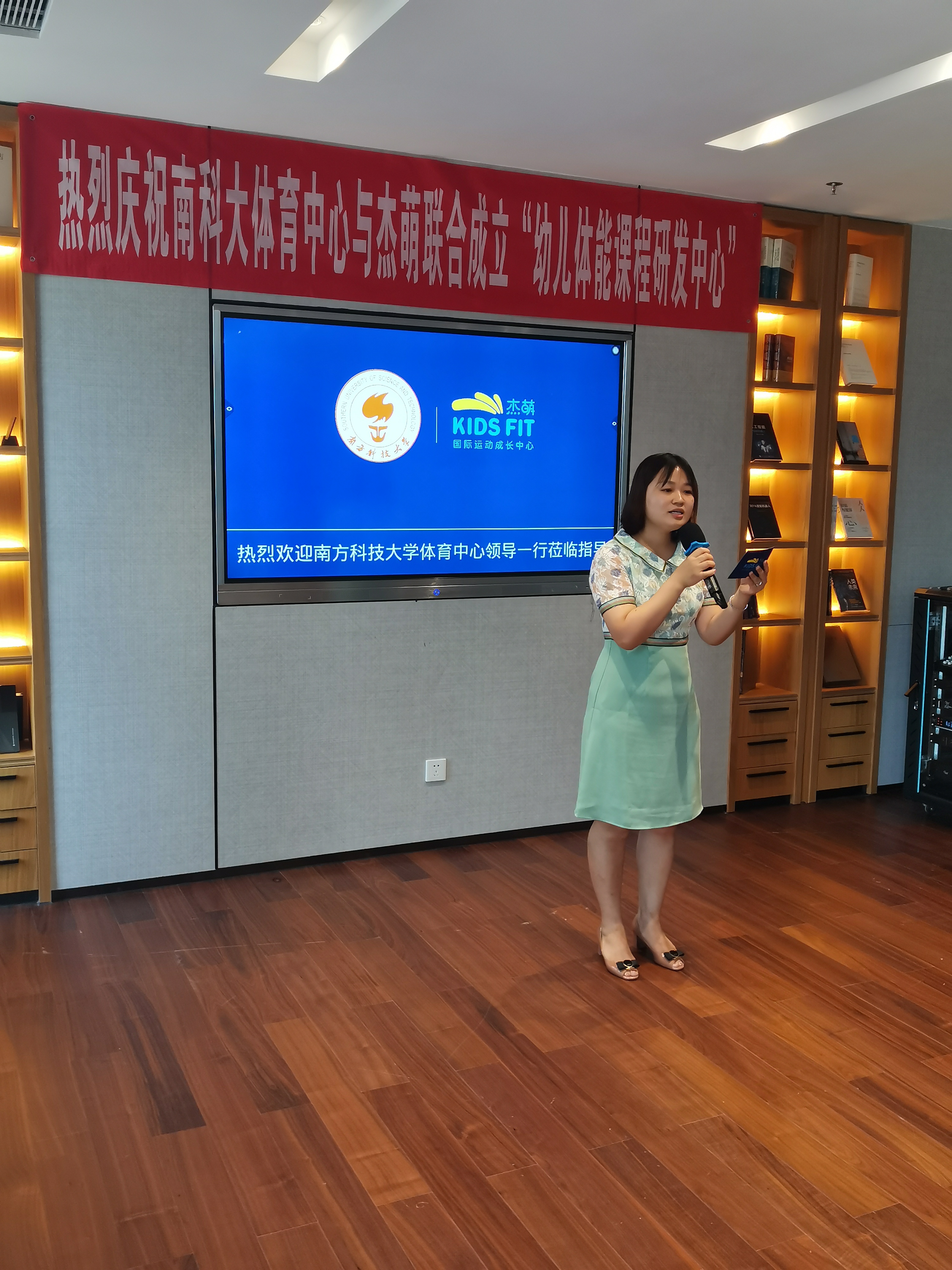 揭牌仪式后,双方举行了座谈会。杰萌国际运动成长中心品牌创始人庄宝红首先介绍了深圳杰萌国际运动成长中心课程体系、师资等情况以及和大家分享了公司的宣传片及南山区第一届幼儿体能比赛活动集锦,并表示杰萌运动将以此为契机,借助南科大体育中心专业力量的支持,提升内部管理,打造标准化课程体系,更好地发展幼儿体能。