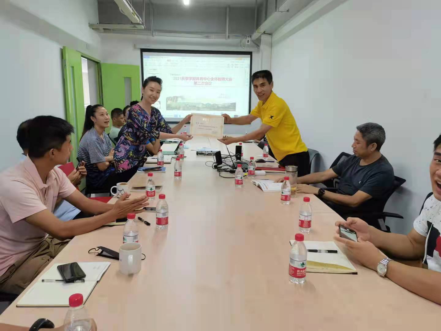 9月9日,体育中心主任董伦红在中心会议室主持召开2021年秋季学期第二次全体教师大会。