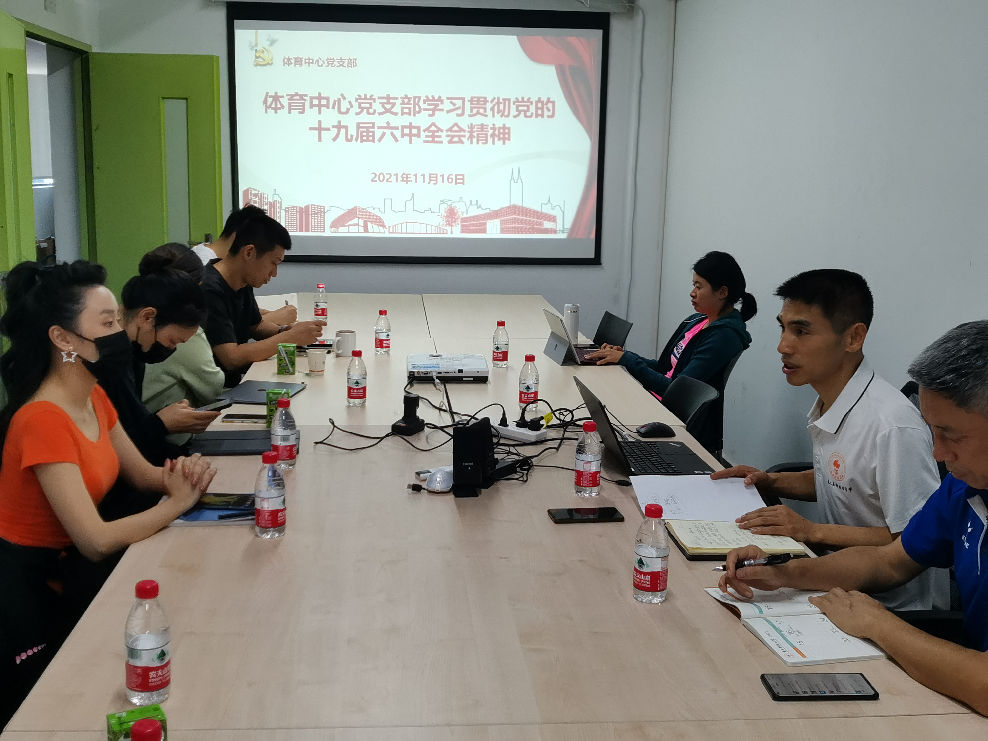 2021年11月16日中午,体育中心党支部书记董伦红在中心会议室主持召开全体党员大会,专题学习贯彻传达党的十九届六中全会精神。