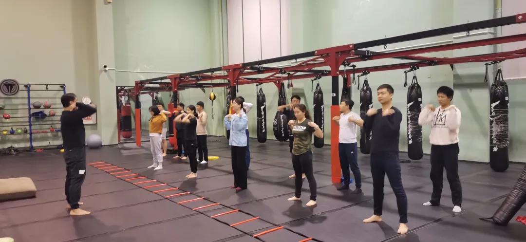 搏击训练课上,国家一级散打裁判员,国家高级脚斗士教练员卢阳老师为此次参训师生带来直拳、勾拳、摆拳、正踢、侧踢、侧蹬等搏击动作教学。