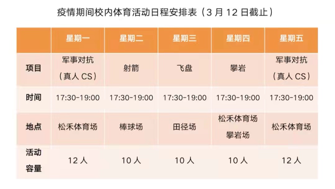 疫情期间,体育中心在校内开设军事对抗、射箭、飞盘、攀岩等小规模、不聚集的体育活动,倡导每天30+分钟出汗运动,强身健体。通过自己的方式与学生心理成长中心、校工会联合为保障师生良好工作、学习状态贡献力量。