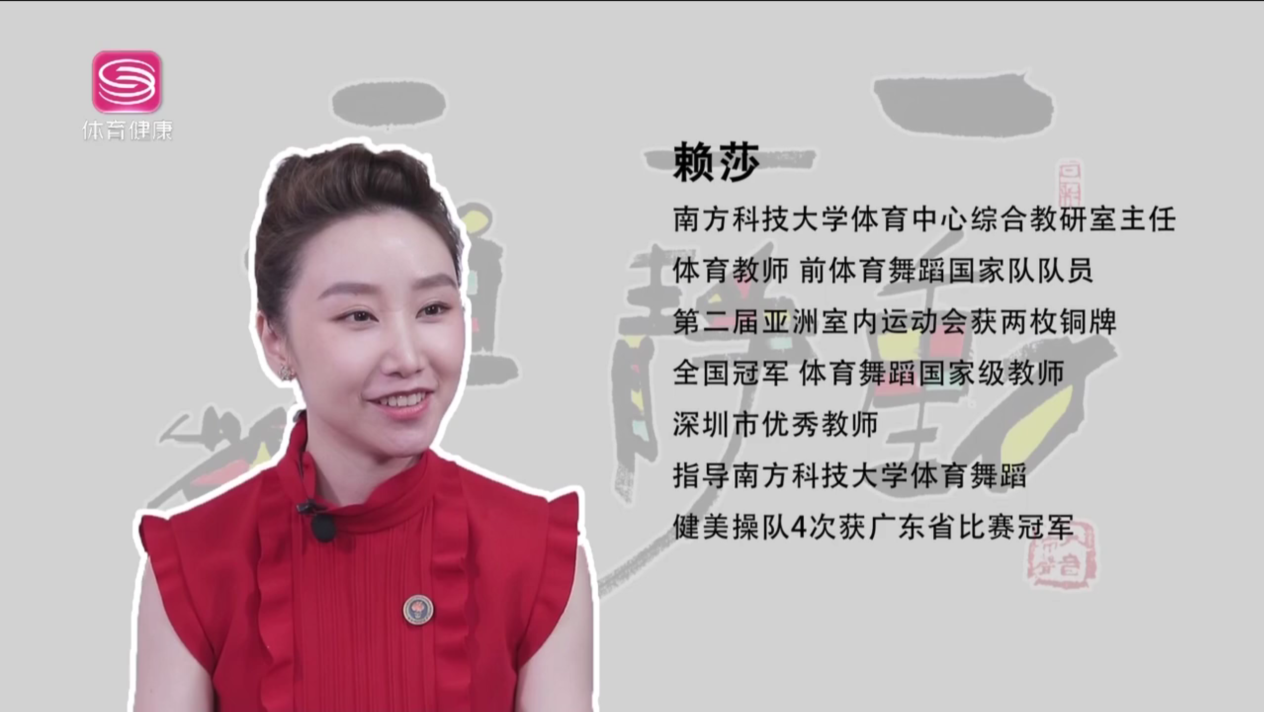 5月22日 ,我校体育中心综合教研室主任赖莎,受邀做客深圳体育健康频道《一动一静一禅茶》栏目。节目采访中,赖莎老师介绍了活跃在大众身边的体育舞蹈运动,指出其起源于民间兴盛于宫廷最终回归百姓的历史,并提出目前我国体育舞蹈普及度高群众基础广泛、社区开展兴盛等特点。作为我校四个社团和体育中心舞蹈队的带队老师,赖莎老师分享了体育舞蹈课程中及外出参赛的体会,即校园体育舞蹈深受学生喜爱且发展势头迅猛,体育舞蹈双人或集体项目中对默契度的要求,能很好的培养学生的团队协作意识。
