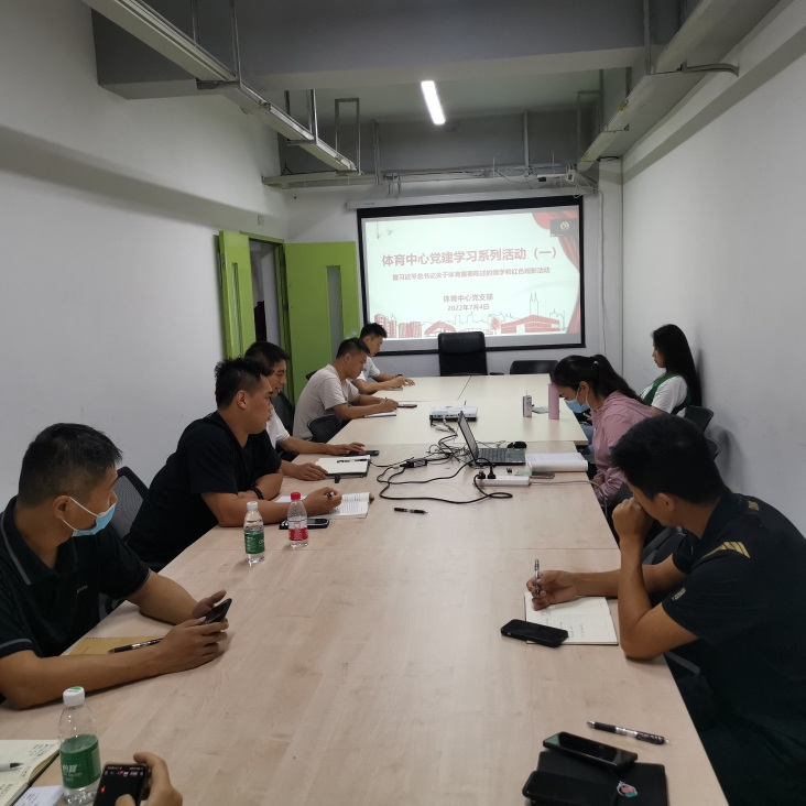 2022年7月4日,体育中心党支部推出党建学习系列活动。活动包括习近平总书记关于体育重要陈述的带领学习和以长征为题材的红色观影。活动分三期进行,7月4日为第一期的学习。