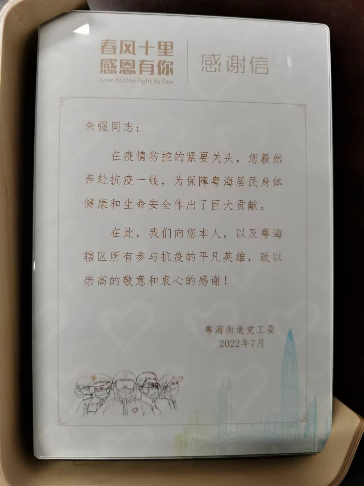2022年7月23日-8月5日,体育中心党支部朱强同志积极投身抗疫一线,参与南山区粤海街道粤桂社区阳光粤海小区卡口防疫工作,负责检查进出小区人员及车辆场所码、行程码、核酸检测记录、识别白名单人员等工作。