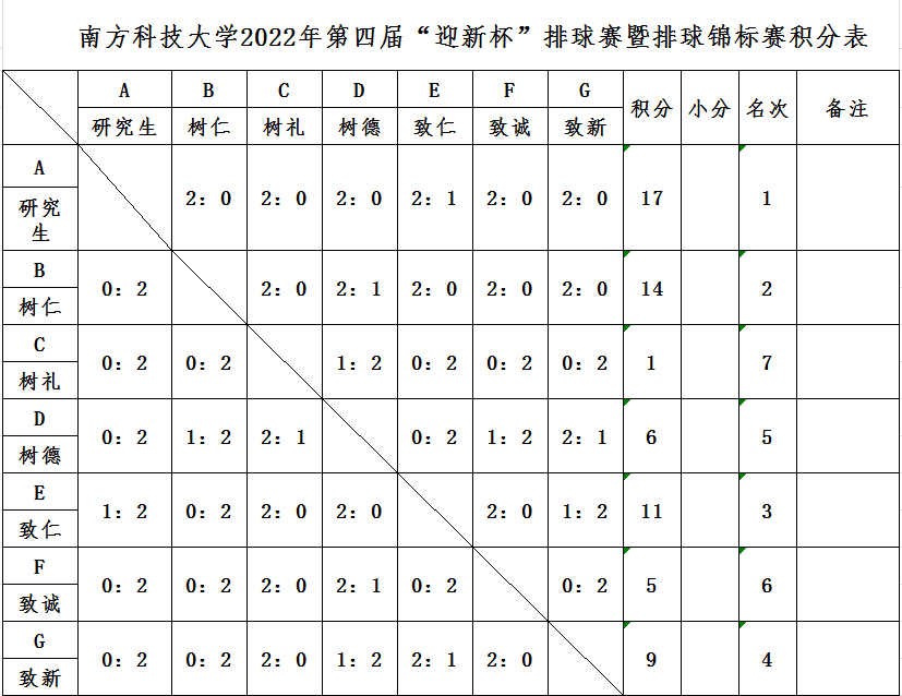 本届比赛,7支参赛队伍经过单循环比赛,最终决出冠亚季军。冠军队伍为研究生院代表队、亚军队伍为树仁书院代表队、季军队伍为致仁书院代表队,张嘉鑫同学被评为本届比赛最有价值球员。