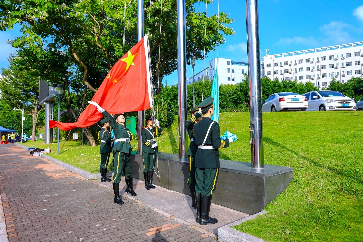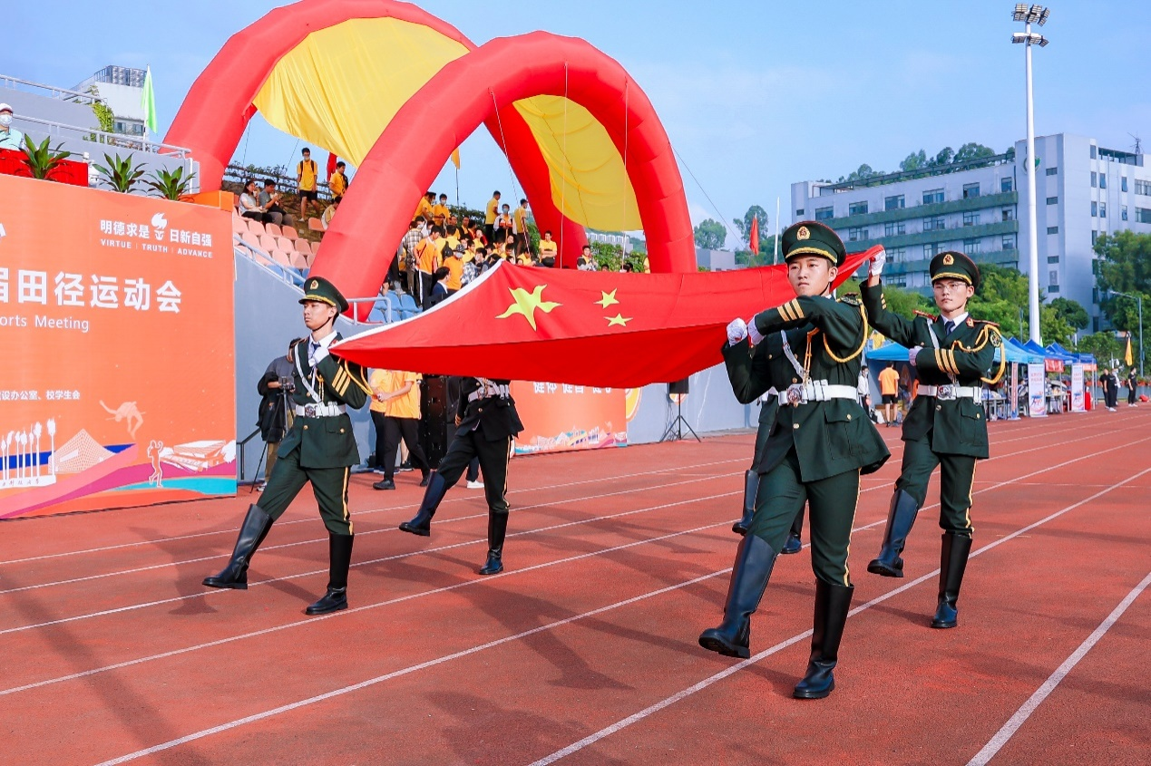 烈日骄阳之下,各方阵神采奕奕,依次入场。国旗护卫队昂首阔步,护送国旗、校旗、校徽依次走过主席台,以青春之名,护国旗之威,心怀光荣和理想,共铸鼎盛山河。