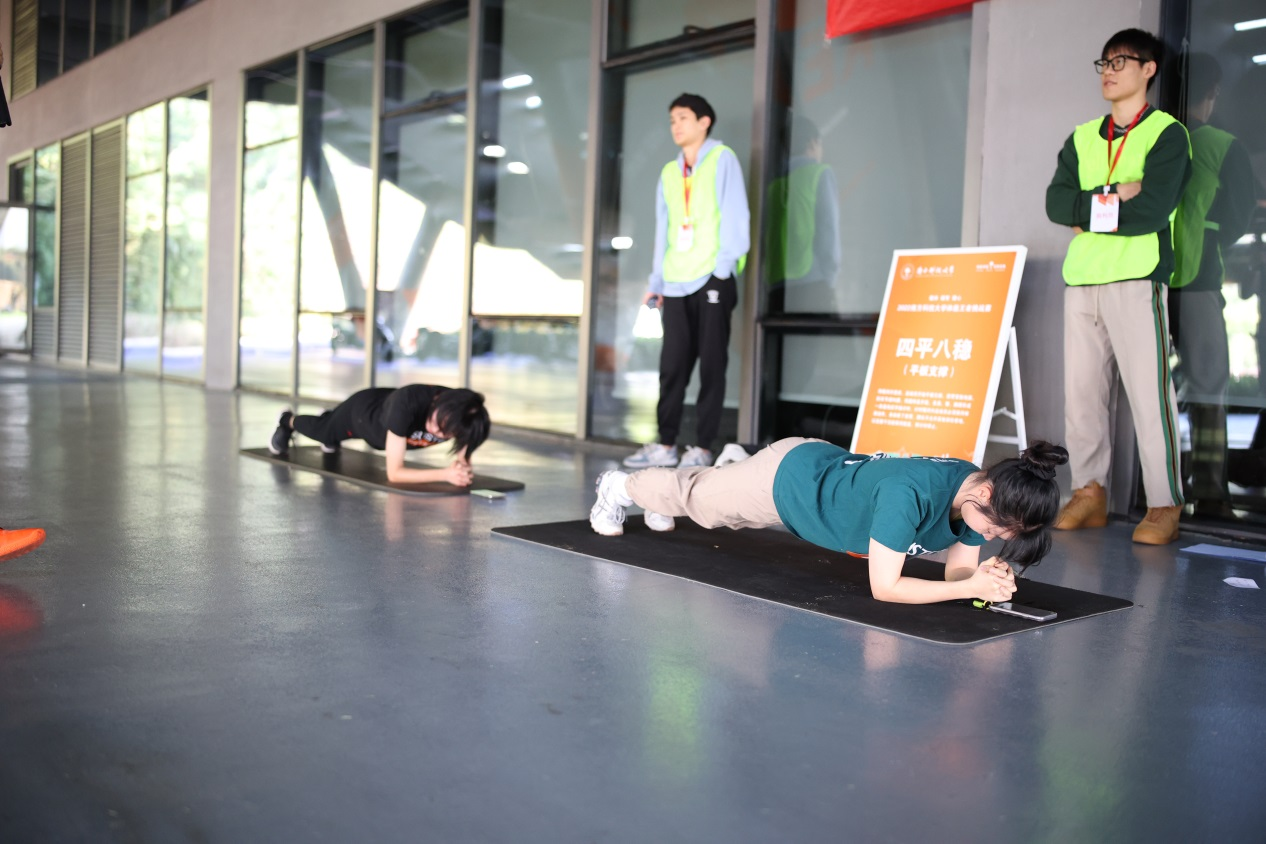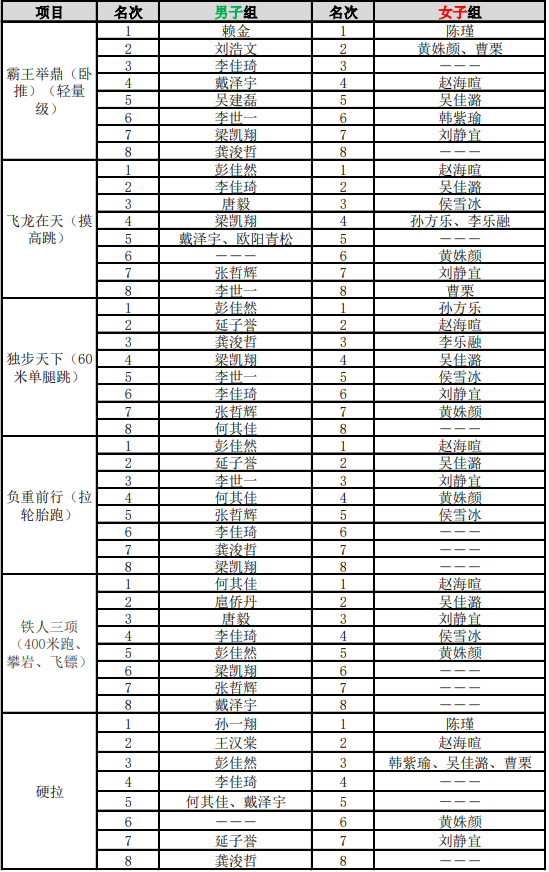 本次大赛共设置十二个比赛项目分别为:空中双飞(双?。?、十全十美(十字跳)、四方平稳(平板支撑)、天天向上(引体向上)、翻江倒海(翻轮胎)、霸王举鼎(卧推)、飞龙在天(摸高跳)、独步天下(60米单腿跳)、负重前行(拉轮胎跑)、铁人三项(400米、攀岩、飞镖)以及硬拉和屈臂撑两项新增项目,并面对全校在校生进行体能比拼。