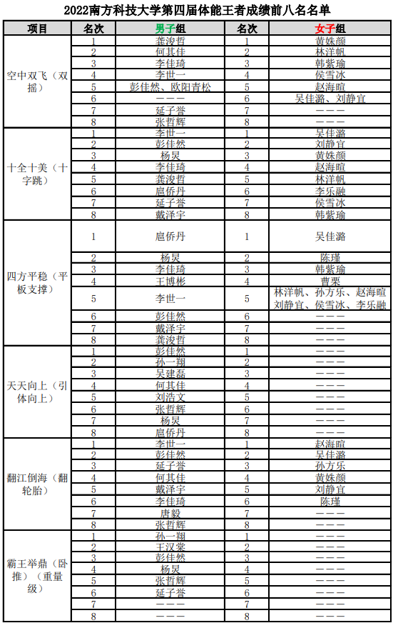 以全校在校生组建的运动员队伍在本次大赛中充分体现南方科技大学科技创新、健康育人、体魄与人格并重的体育教育观。同学们不仅创造了属于南科大体能王者大赛的校纪录,各项目各级别的冠军更是荣登南方科技大学体能英雄榜,成为了南方科技大学的体能王。最后伴随着同学们的欢呼声,比赛圆满结束。