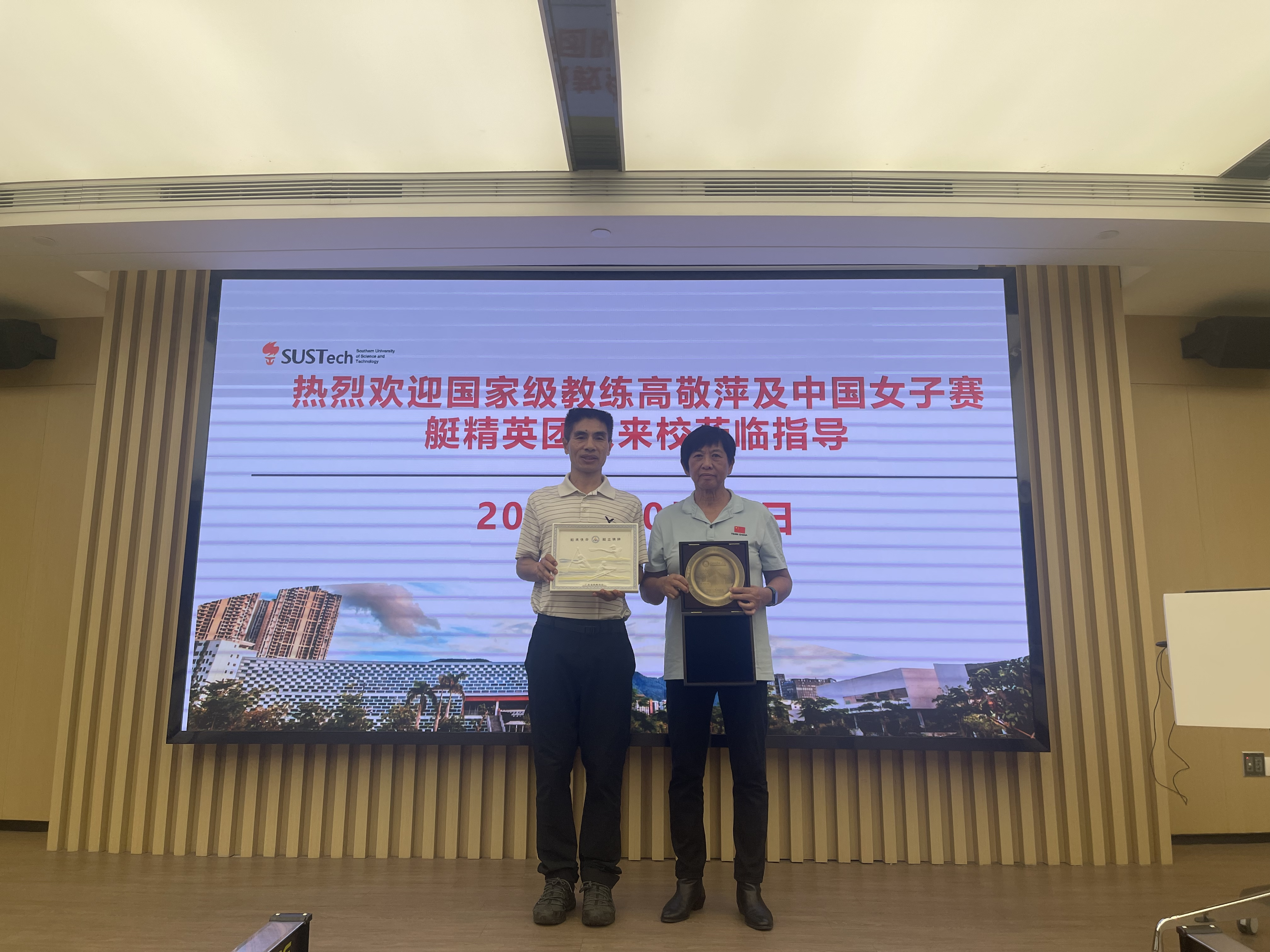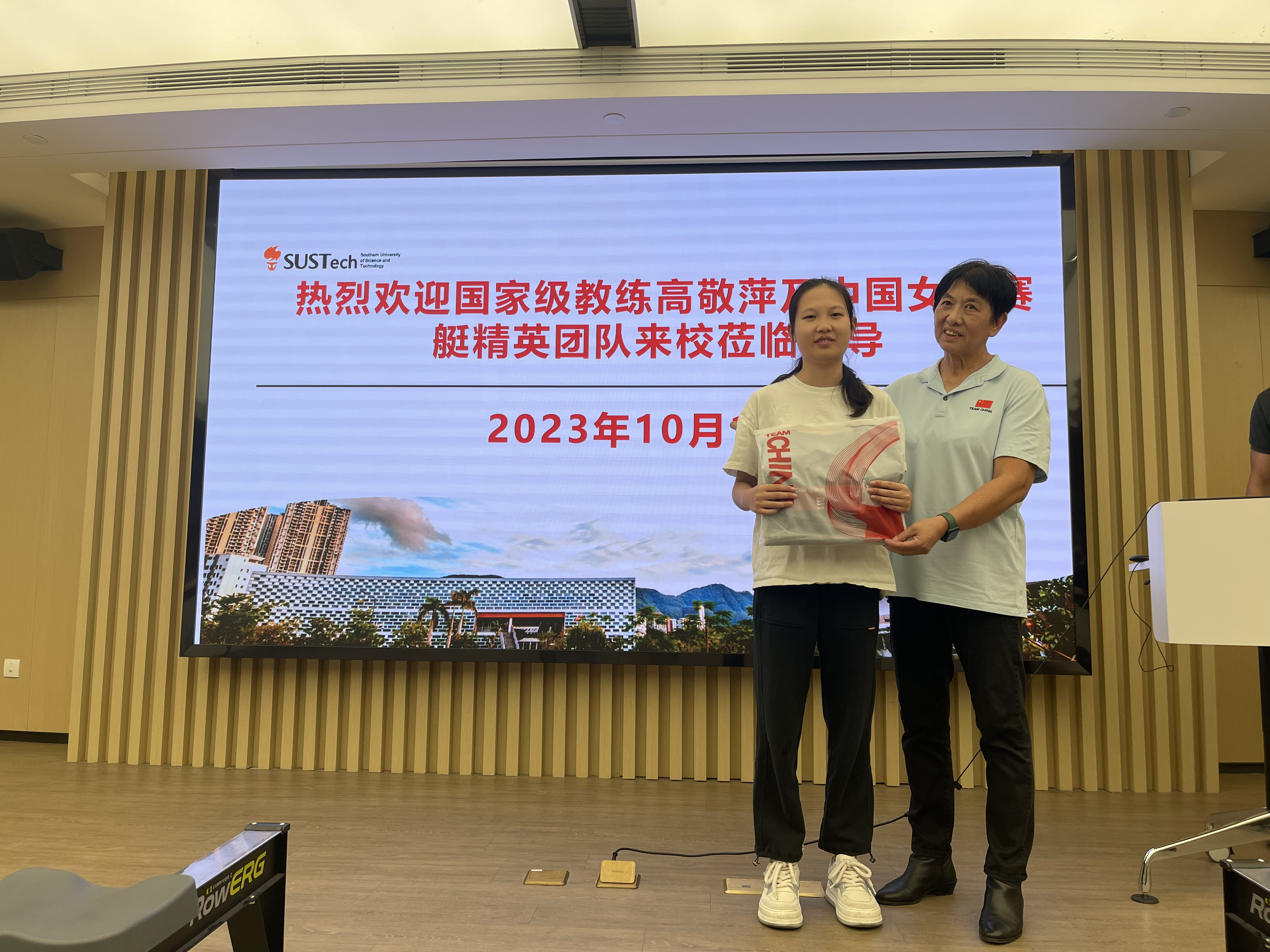 在讲座期间,主讲老师高敬萍和南方科技大学体育中心董伦红主任之间进行了友好的交流,并相互赠送了纪念品,这体现了双方对于赛艇运动的共同热爱和支持。