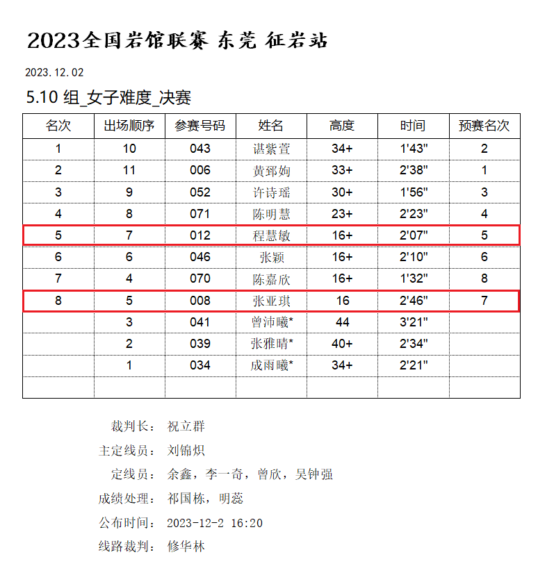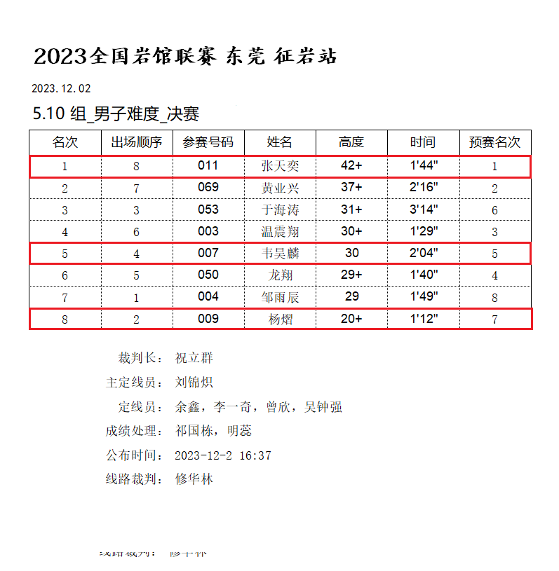 12月1-2日,由体育中心董伦红主任领队,罗林斯特老师任教练带领我校攀岩队参加2023年全国岩馆攀岩联赛(东莞站),最终我队张天奕同学荣获普通组男子难度赛冠军。
