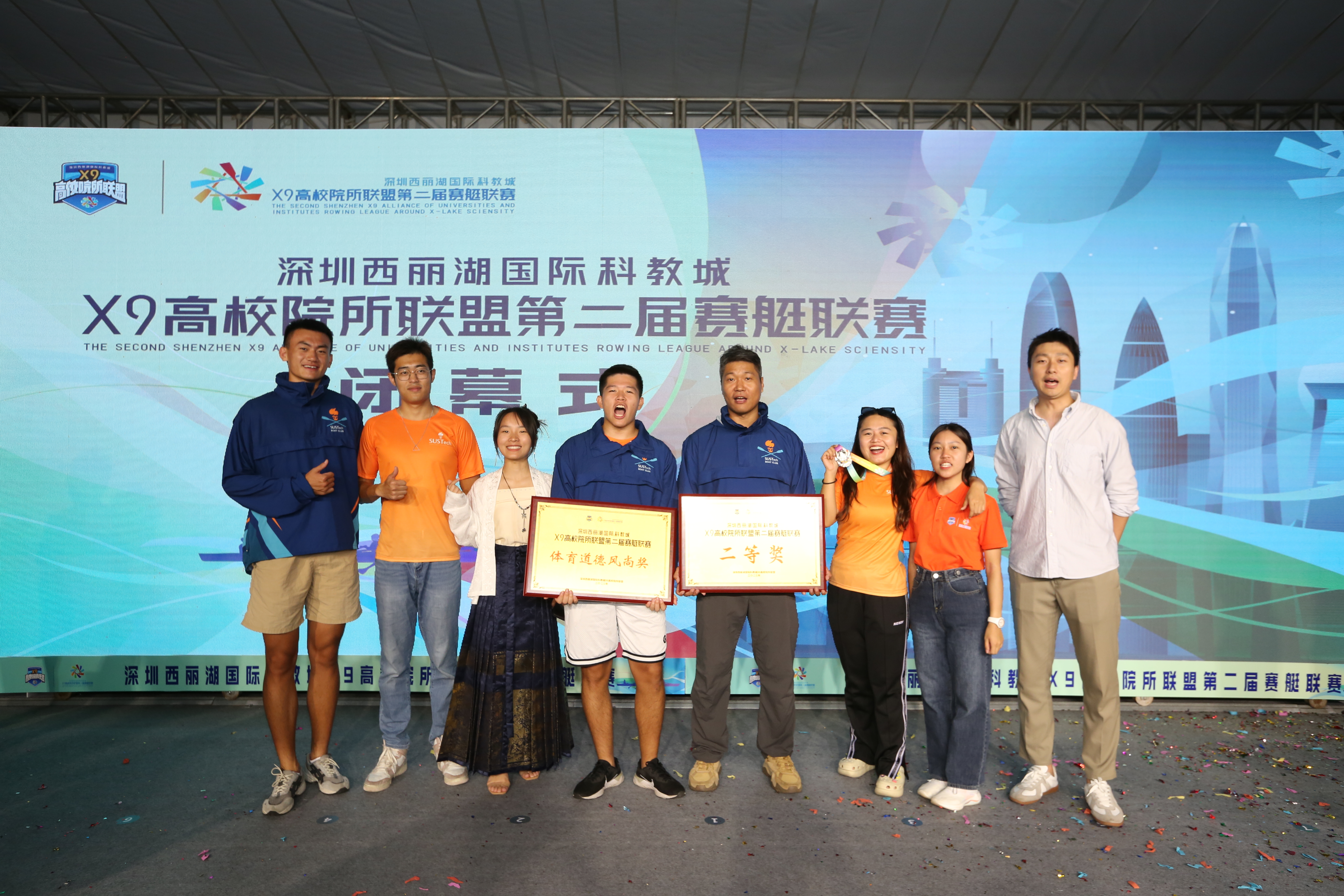 11月15日,深圳西丽湖国际科教城X9联盟(以下简称“X9联盟”)第二届赛艇联赛秋季赛第三站在大学城拉开帷幕。来自深圳大学、南方科技大学、清华大学深圳国际研究生院、北京大学深圳研究生院、哈尔滨工业大学(深圳)、天津大学佐治亚理工深圳学院、深圳理工大学(筹)、鹏城实验室、香港中文大学(深圳)的300余名院士、教师、科研人员和学生共同组成20余支队伍,展开激烈角逐。南方科技大学赛艇队在本次联赛中获团体总积分二等奖、体育道德风尚奖、最佳划手奖等荣誉。