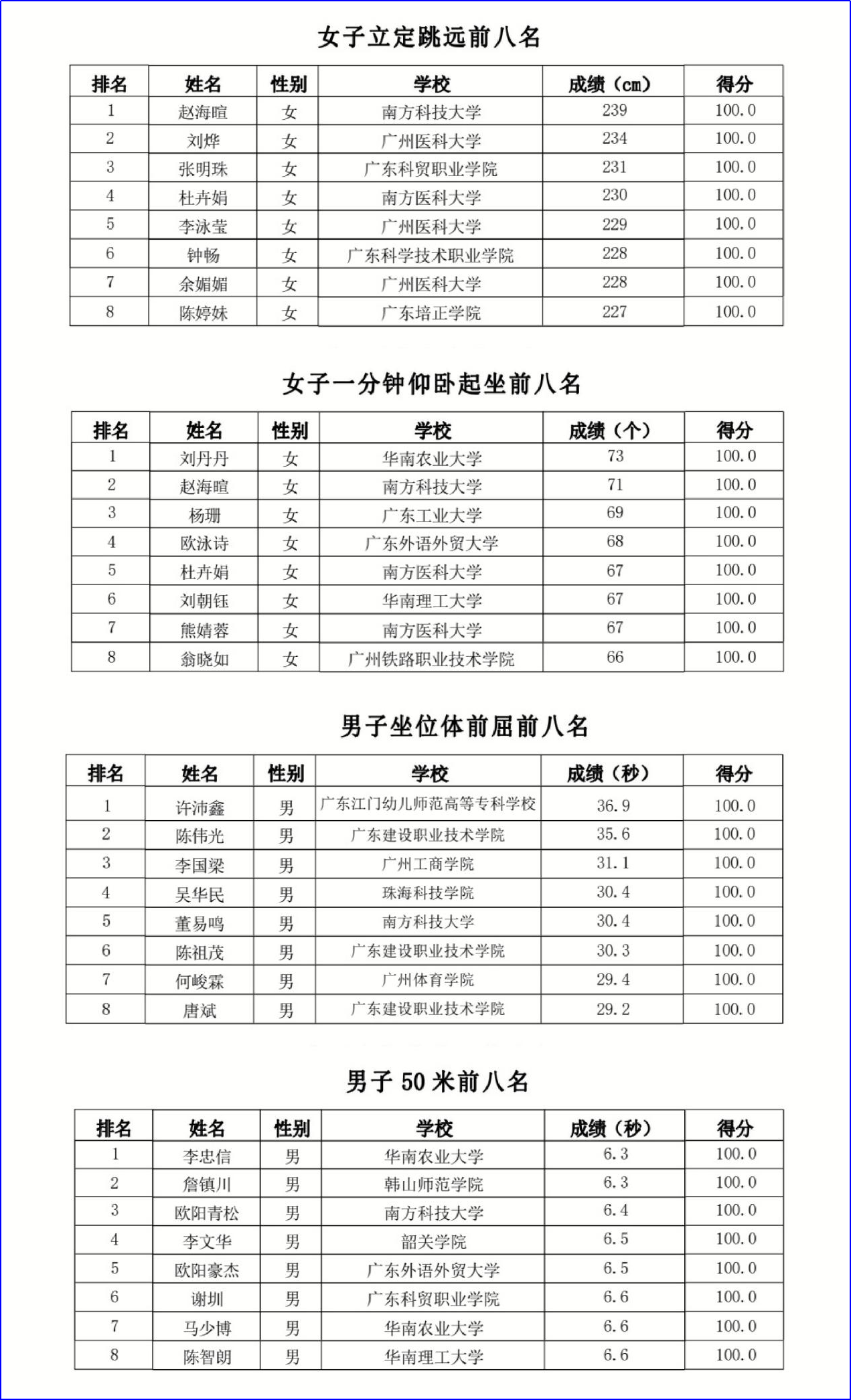 近年来,教育部每年都对全国学生进行国家体质健康标准抽测,广东省学生抽测的优良率在全国名列前茅,但是各学段的发展极不平衡,其中大学生体质健康标准测试成绩优良率达不到要求。为推动各高校体育工作的开展,广东省教育厅决定举办此次测试赛。