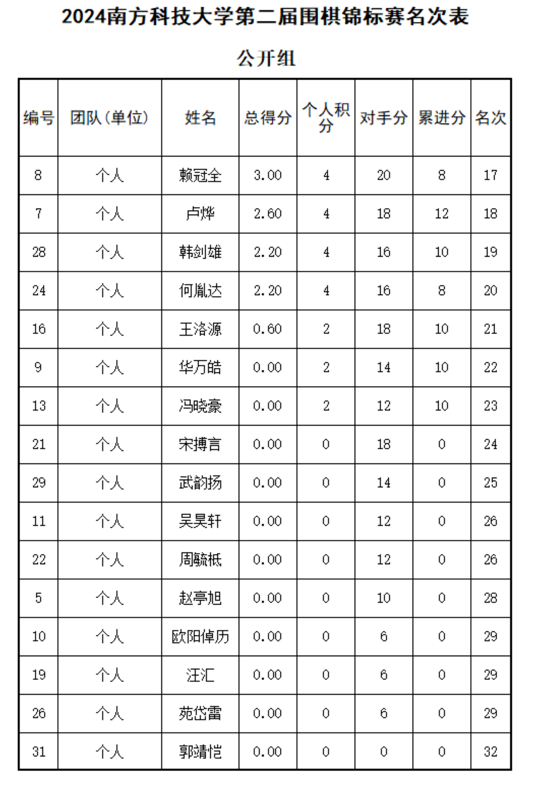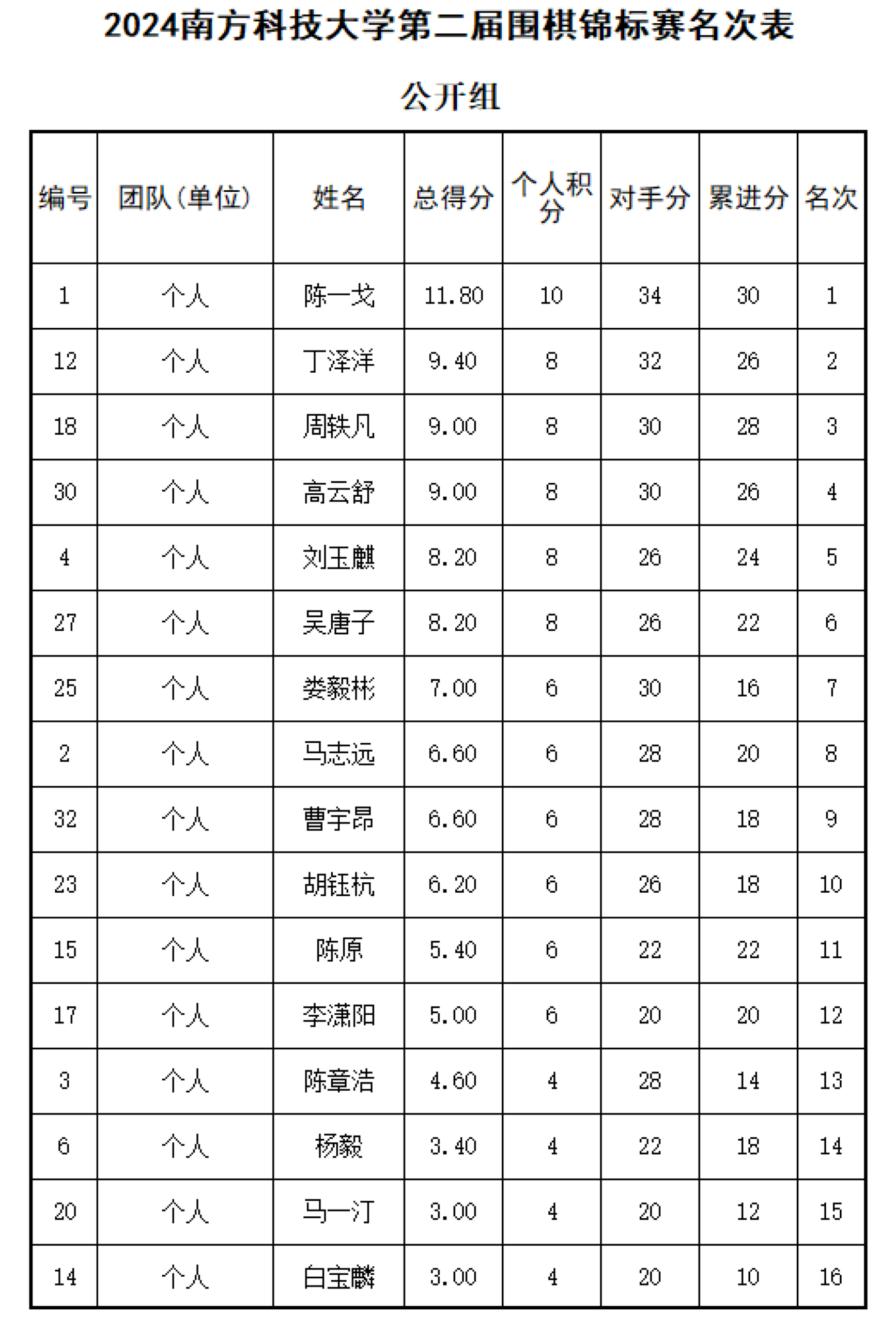 2024年5月18日在南方科技大学14栋致新书院活动室举行了南方科技大学第二届围棋锦标赛。本次锦标赛主办单位为南方科技大学体育运动委员会,承办单位为体育中心、校围棋社,协办单位为学生社团联合会、各书院、研究生院。参赛选手包括来自各书院的本科生以及来自各学院的研究生,总共32名选手。本次比赛仲裁委员会成员为董伦红、侯思宇;裁判长为丁泽洋,其他裁判为梅一涵、高云舒;经过5轮积分赛的激烈角逐,最终有八名选手脱颖而出,前八名依次是:陈一戈、丁泽洋、周轶凡、高云舒、刘玉麒、吴唐子、娄毅彬、马志远。