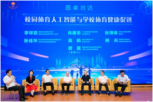 以“校园体育人工智能应用前景与现实路径”为主题的圆桌对话为本次论坛画上圆满句号。深圳大学体育学院席翼教授担纲环节主持人,引领来自各界的领导、专家、教研员、一线特邀校长以及行业代表,围绕核心议题进行了深入讨论。