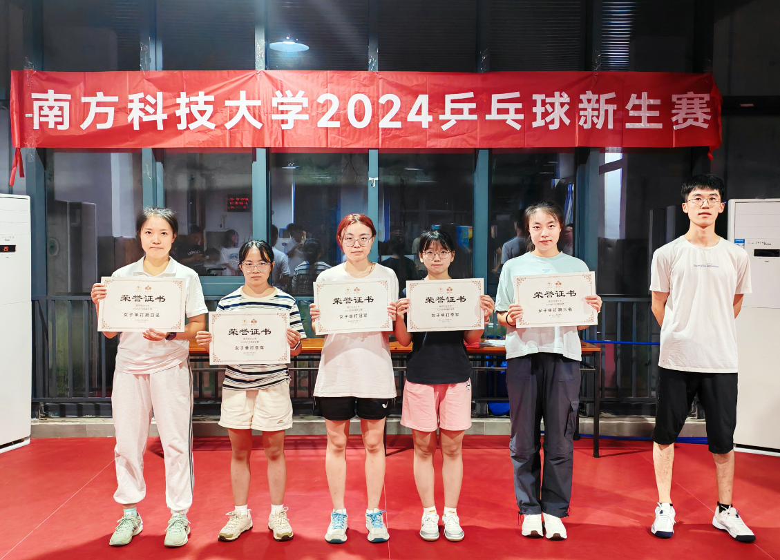 南方科技大学2024乒乓球新生赛于2024年10月20日在南科大乒乓球馆落下帷幕。本次比赛由南科大体育中心主办,南科大乒乓球社承办的全校赛事。比赛分为男子单打、女子单打两个组别,所有参赛选手均为南方科技大学本科、研究生的2024级新生,共吸引了156人参加角逐。最终杨皓博、汪涵、聂明宇获得男子单打前三名,何慧怡、许思源、陈淑玲获得女子单打前三名。