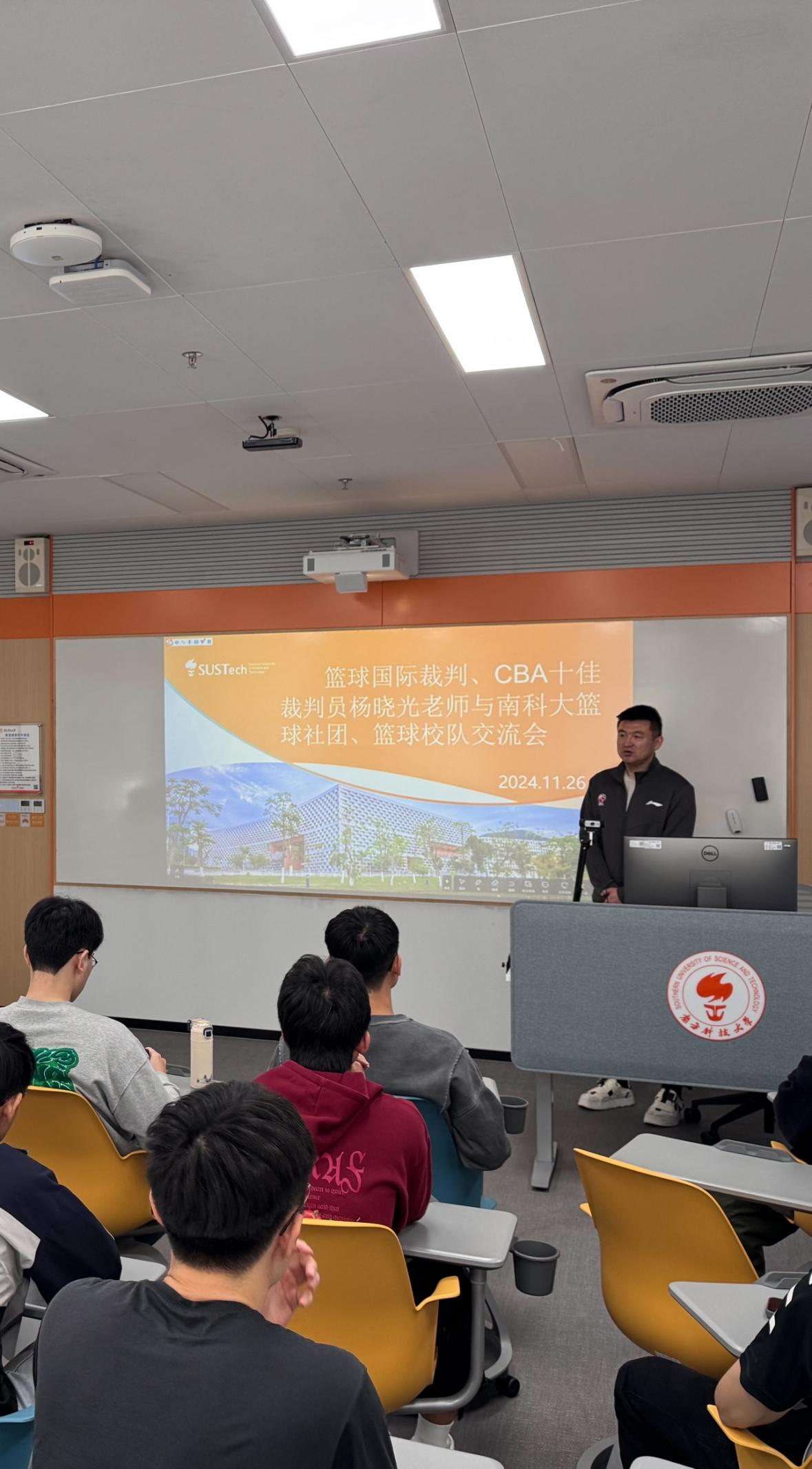 11月26日,篮球国际级裁判,CBA十佳裁判员杨晓光老师应邀来到南方科技大学,与篮球社团及校篮球队队员在我校第三教学楼405教室开展了一场别开生面的篮球规则解读与交流活动。