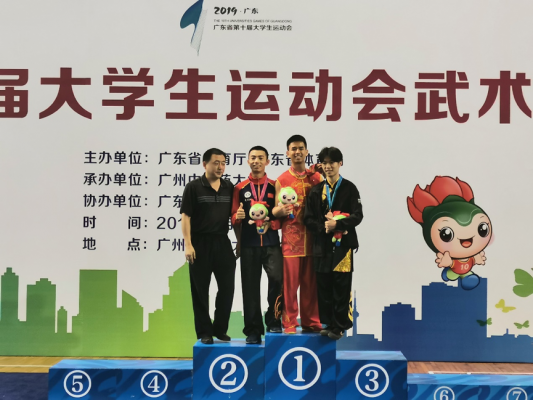 2019年5月19日至5月24日,广东省第十届大学生运动会武术套路比赛在广州中医药大学(大学城校区)举行。我校2017级学生李岱峰获得了男子甲组自选南棍冠军,这也是我校在本次大运会上摘得的第二块金牌。