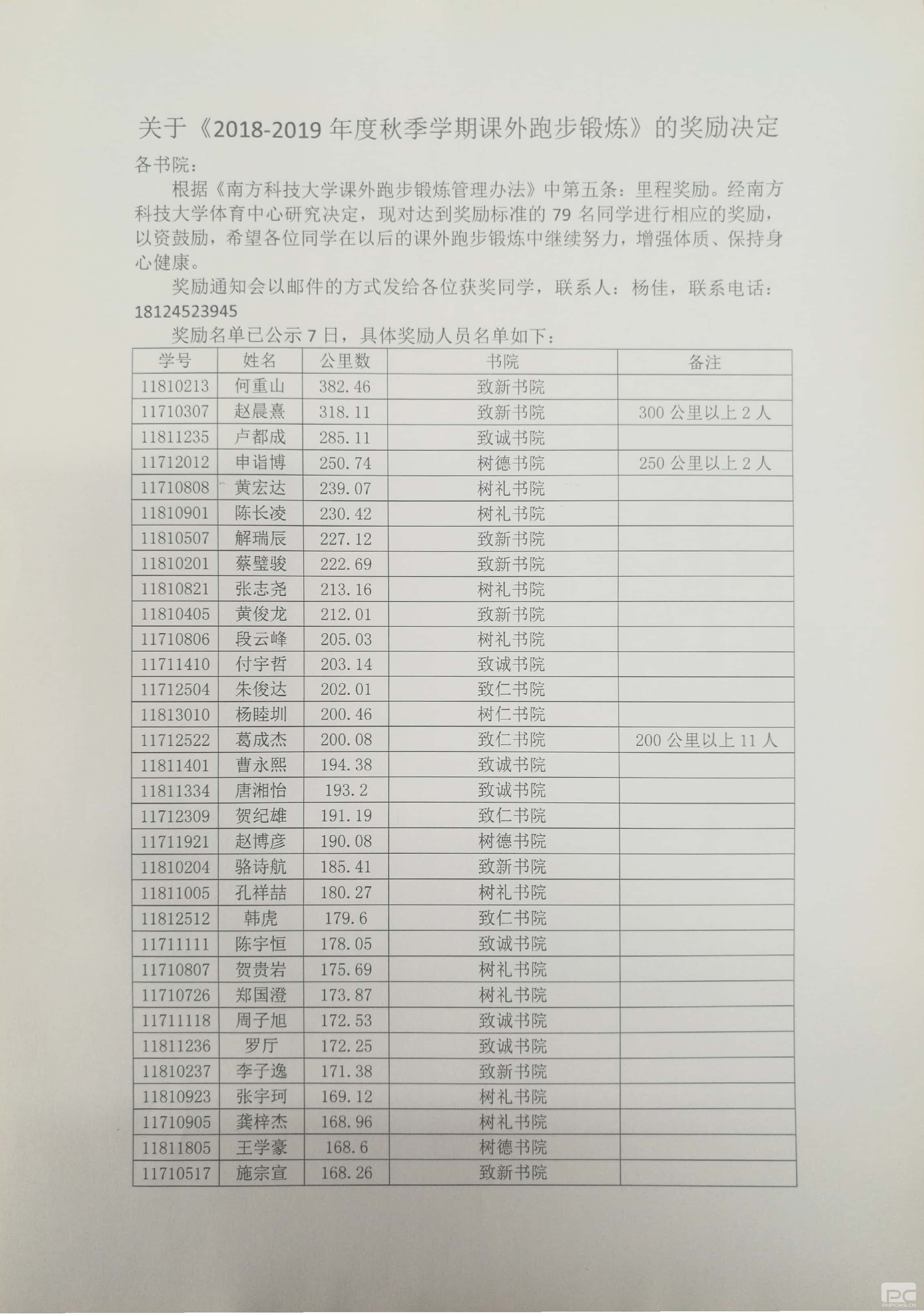 关于《2018-2019年度秋季学期课外跑步锻炼》的奖励决定